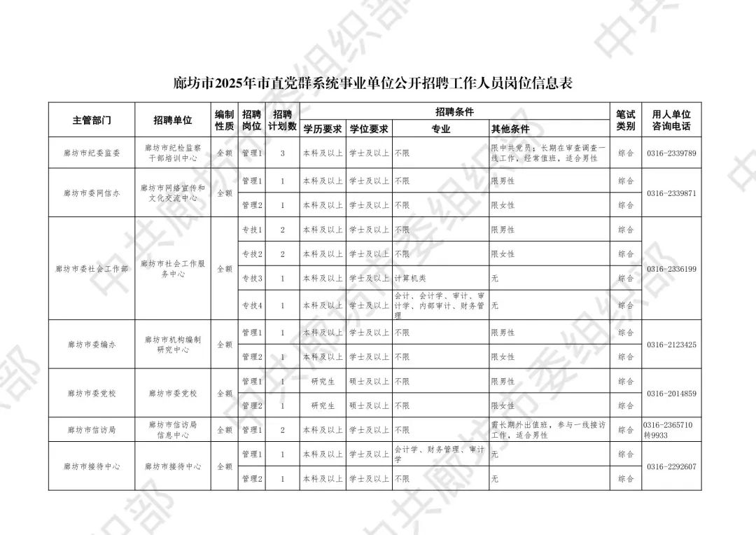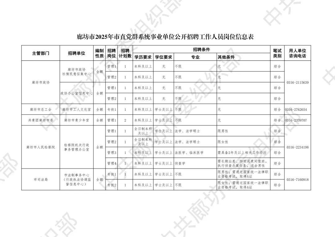 1.廊坊市2025年市直党群系统事业单位公开招聘工作人员岗位信息表