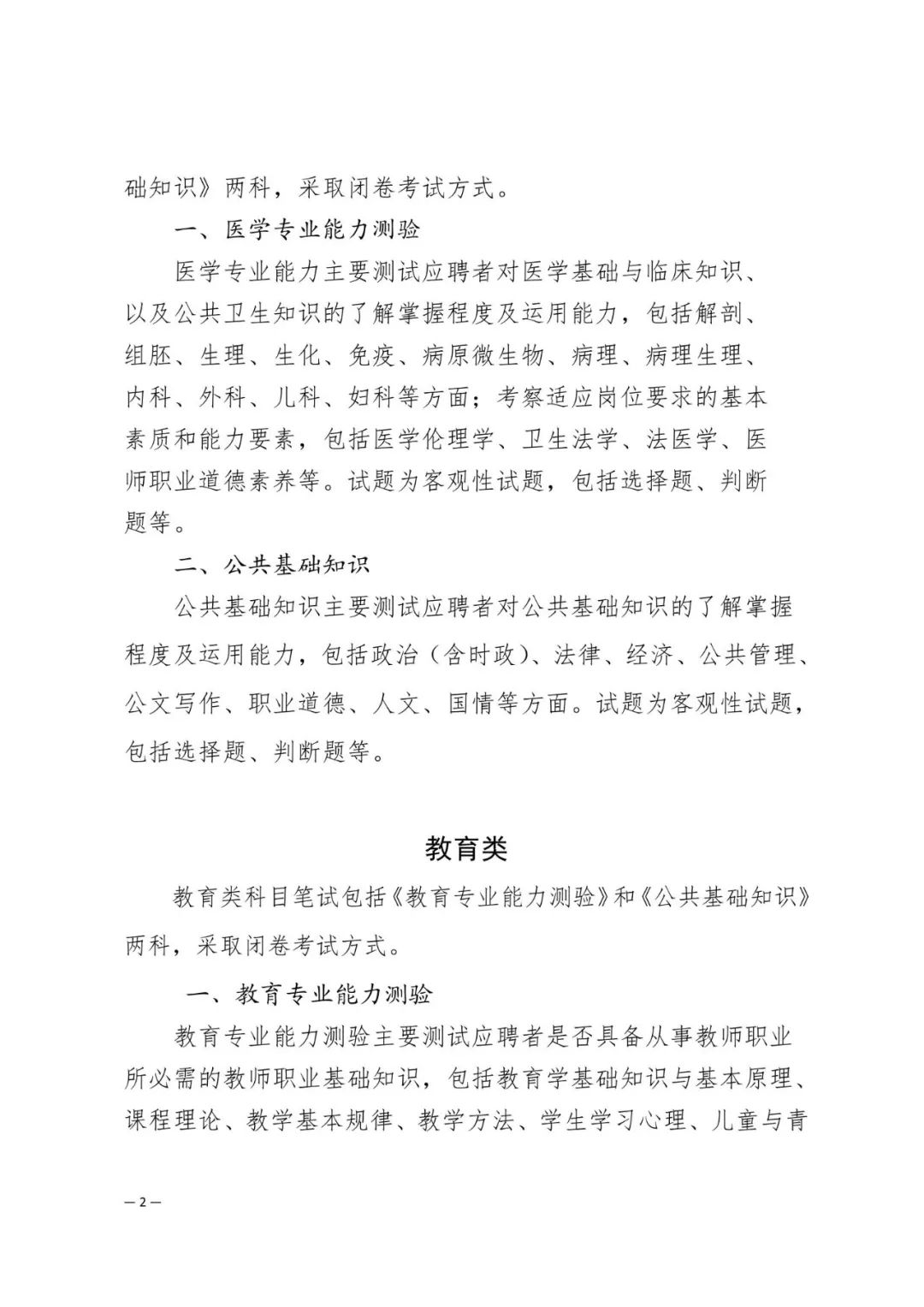 1.笔试科目。报考综合类岗位的应聘人员参加综合类科目笔试;报考医学类岗位的应聘人员参加医学类专业科目笔试;报考教育类岗位的应聘人员参加教育类专业科目笔试。每类分两个科目,其中:《职业能力测验》、《医学专业能力测验》、《教育专业能力测验》考试时限为90分钟,满分为100分;《公共基础知识》考试时限为120分钟,满分为100分。采用闭卷考试方法,笔试总成绩为以上两科考试成绩之和,满分为200分。
